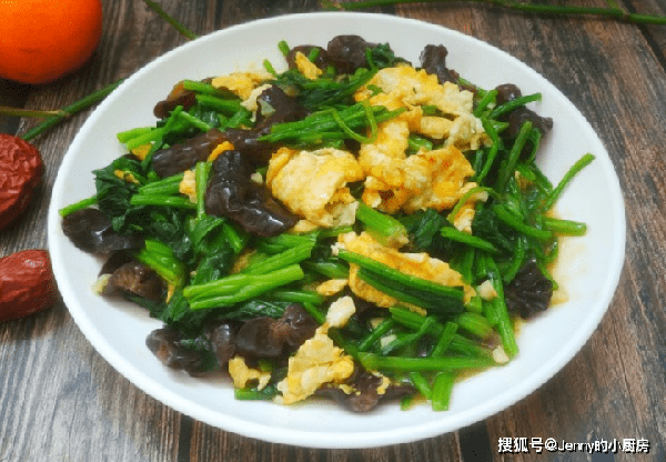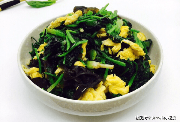 重新加油烧热,倒入菠菜、木耳翻炒十几秒,再倒入鸡蛋,加入少许盐、鸡精,快速翻炒均匀,这道菜就做好了。