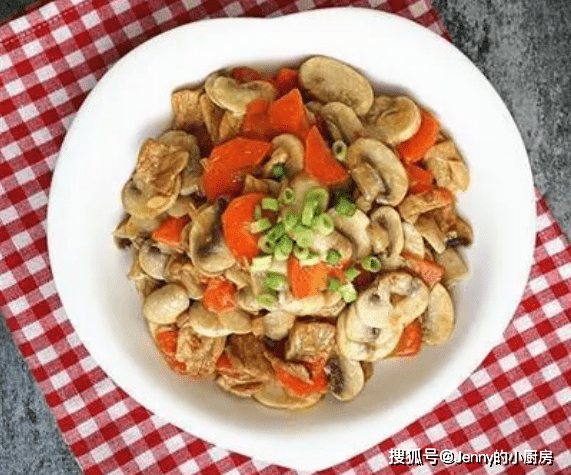 留底油放入葱姜蒜炒出香味,再倒入口蘑、胡萝卜翻炒,炒到口蘑变软。