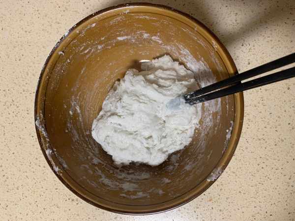 汤圆粉倒入大碗中,先加入85度以上的开水,用筷子搅打成面絮状,汤圆粉会变得非常有粘性。然后多次少量加入凉水搅拌剩余的干面粉,揉成面团。盖上盖子稍稍松弛一下,揉成比较光滑的面团。