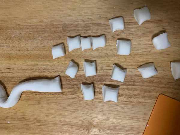 2、汤圆粉这样和面,面团很有弹性,就好像橡皮泥,既柔软又非常有弹性,把面团搓成长条状,切成大小相对均匀的面剂子备用。