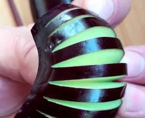 再准备茄子,茄子洗净,切成两半,再在一边垫一根筷子,切成这个样子。