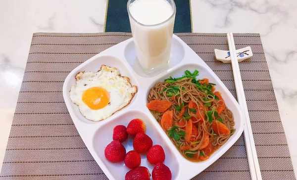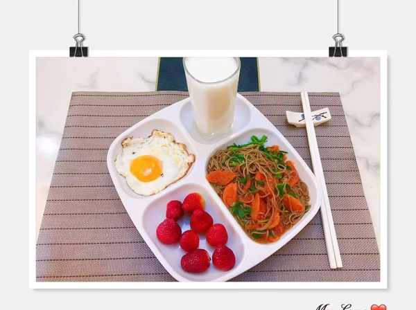 早餐:番茄菠菜焖荞麦面、煎鸡蛋、牛奶、草莓。