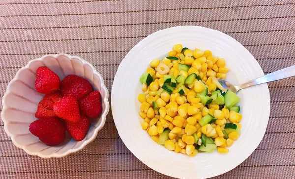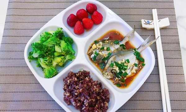 午餐:清蒸鲳鱼、水煮西兰花、杂粮饭、草莓。