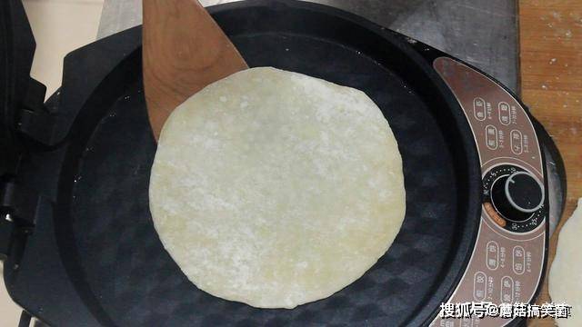 5.电饼铛烧热、不用刷油,把饼坯直接放入锅中,盖上锅盖烙1分钟,烙制烙馍微微鼓起,底面呈微黄色时翻面,翻过来之后再烙一分钟,烙馍另一面也呈微黄色时即可出锅。