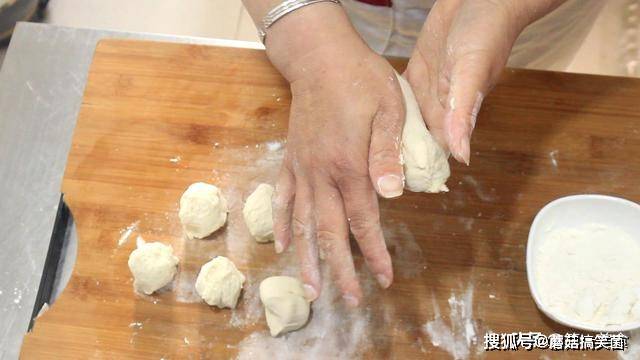 2.揉好以后取出来,在案板上撒上底面,把面团揉光滑,搓成长条,揪成大小均匀的面剂子,在面剂子上撒上面粉 以免粘连,把面剂子放在虎口处,向里摁压收紧,团成圆面坯。