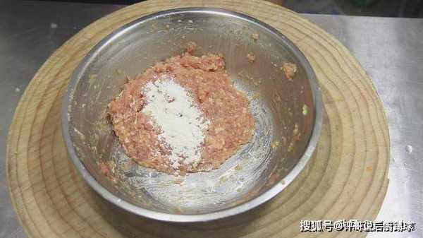 3.加入干淀粉20克,继续摔打(使肉馅凝固在一起不易碎)。肉馅打好之后,加入一点植物油(加入植物油使肉馅不粘连),静止腌制10分钟使肉馅充分入味。