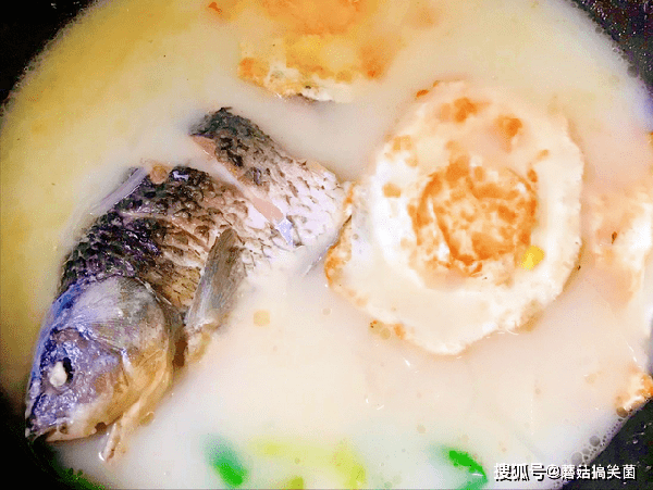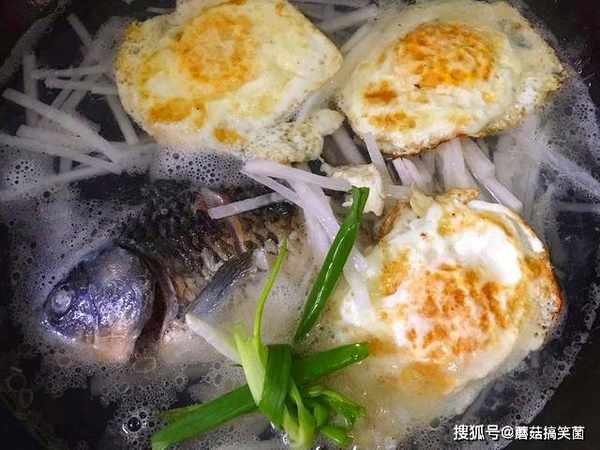 7、大火催开以后,再转成中小火,接着放入三个荷包蛋、葱结和萝卜丝,继续慢炖20分钟,具体时间根据鱼身大小而定,随机应变,萝卜丝和鸡蛋几分钟就可以。