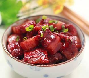 五花肉775克、腐乳汁70克、料酒30克、水2000毫升、鸡精少许、小葱少许