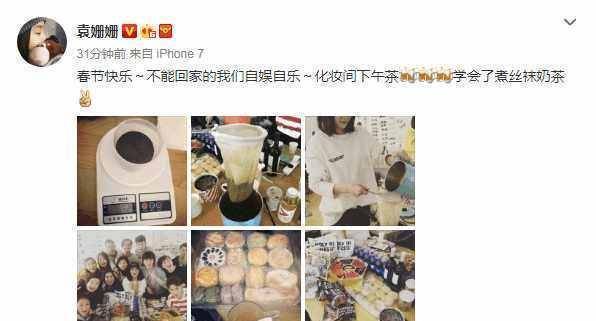 近日,袁姗姗给大家分享了一组自己学做丝袜奶茶的照片,并且祝大家春节快乐!