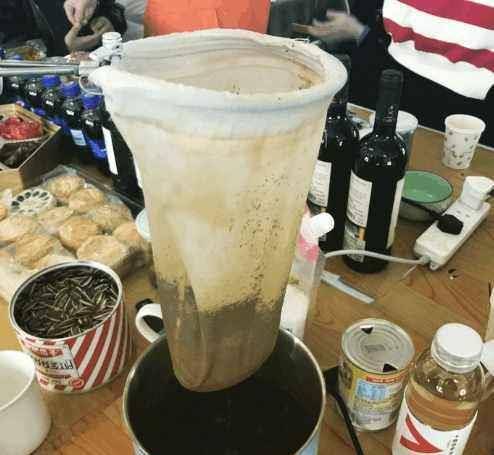 袁姗姗有模有样的把奶茶导入筛网,现学现卖的技术一流。