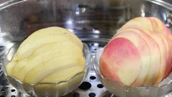 第2步:将苹果和梨分别带皮、带核切片,放入锅中蒸熟,上汽后蒸十分钟就可以了。(带皮、带核一起蒸,可以让水果的养分翻倍哦~)