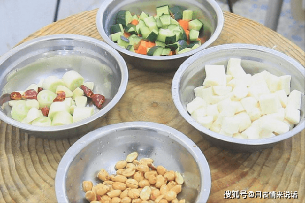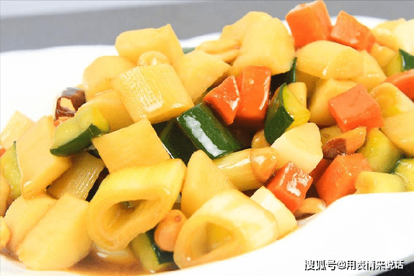 1.准备山药两根,削去外皮后切成一厘米左右的方丁,加入清水浸泡起来,放入米醋5克,食盐2克,防止山药氧化变黑;切点胡萝卜丁、黄瓜丁放在一起。