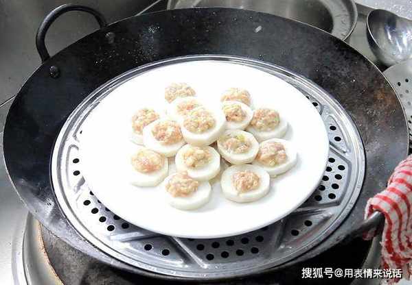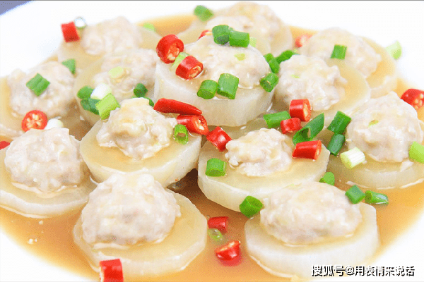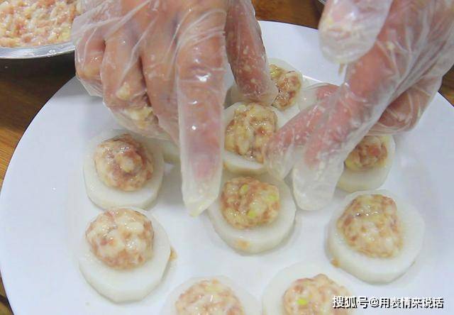 4.10分钟以后抓出一点肉馅,用双手左右晃动,把肉馅团成一个个小肉丸,放在萝卜的中心部位,摆放在盘子中,一个一个做完所有的肉丸子。