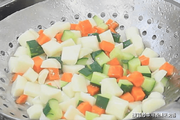 3.锅内烧水,放入米醋5克保持山药的亮白,等到山药快要焯熟,放入胡萝卜粒和黄瓜粒,继续焯水20秒钟,全部倒出控水。