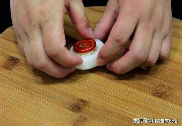 1.准备白萝卜一个,削去外皮,切去头部和根部,切成1厘米左右的厚片,拿一个瓶盖放在萝卜片上面挖去萝卜的中心,把切好的萝卜挖完以后放在盆中。