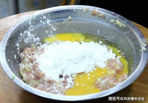 3.肉末中放入料酒5克,食盐2克,放入葱姜末,加入少量的清水,用手搅匀顺着一个方向搅拌,加入清水可以使肉的口感更加滑嫩,打入一个鸡蛋,放入玉米淀粉8克,继续顺着一个方向搅拌,并摔打上劲,最后倒入香油5克,放置腌制10分钟。