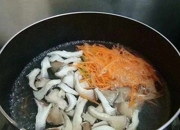 4. 起锅烧水,水沸后先放入平菇、胡萝卜煮两分钟左右捞出控干水份。