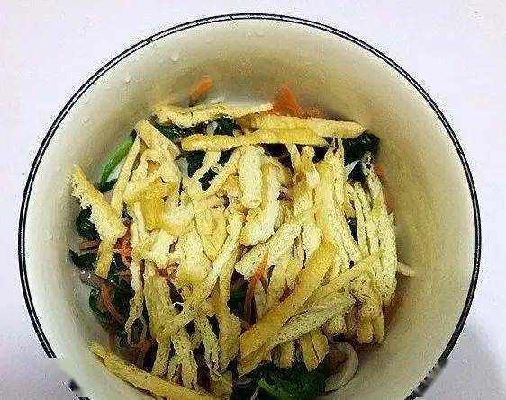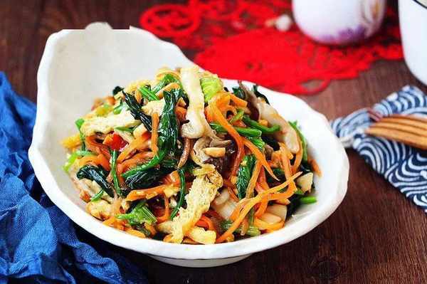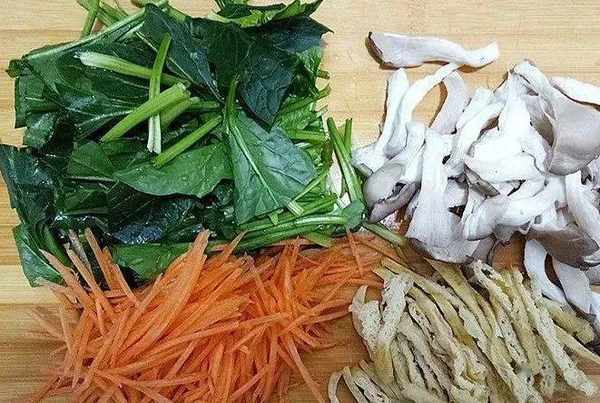 6. 把焯过水的菠菜、平菇、胡萝卜一起放入盆中,加入切好的油豆腐。