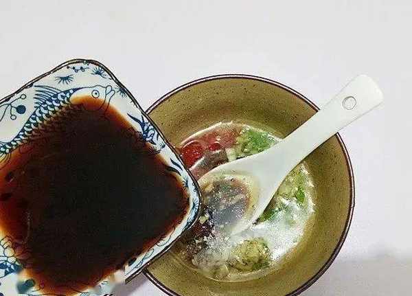 8. 依次加入2勺生抽、1勺蚝油、2勺香醋、1/2勺白糖、适量食盐、少许味精充分搅拌均匀。