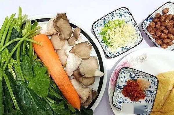 菠菜250克、平菇250克、胡萝卜1根、炸油豆腐5块、油炸花生、适量剁椒1茶匙、葱末适量、大蒜5瓣、生抽2茶匙、香醋2茶匙、蚝油1茶匙、白糖1/2茶匙、食盐适量
