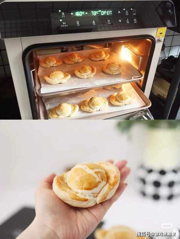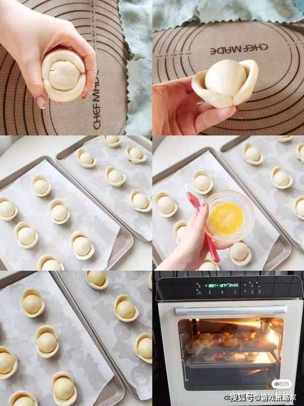 取一个松弛好的大面团,自中间对折,压扁后擀成圆形,放入25g豆沙馅料,用虎口收口收紧,翻过来让收口朝下收圆放在烤盘上;再取一个面团,自中间对折,压扁后擀成圆形,中间切开一分为二,包裹在圆形酥两边,形成一个元宝形状,接口处按压紧