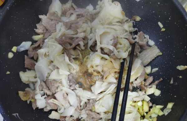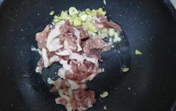第五步:加上一些蒜末和姜末,快速爆炒出蒜香,倒入瘦肉煸炒至变色,加上半勺老抽调色,翻炒均匀。