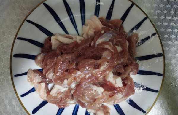 第三步:碗中加上半勺料酒,加上生粉一勺半,加上一丢丢食盐和胡椒粉,食用油几滴,反复抓至均匀即可,准备好一些配菜,开始制作这道糯米笋炒肉片吧。