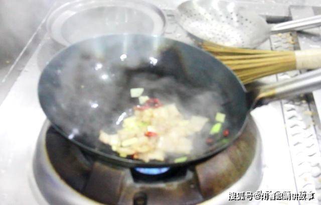 :倒入葱、姜、蒜、干红椒爆香,再加入1勺豆瓣酱、1勺老干妈,炒出香味时,倒入配菜,翻炒几下,加入白糖、胡椒粉、鸡粉(这个时候不用放盐,因为豆瓣酱和老干妈本身又咸味)。