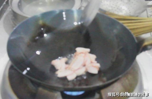:锅中倒入植物油,油烧热之后倒出,再加入一勺冷油,热锅冷油,加入五花肉翻炒,炒至五花肉变亮流油。