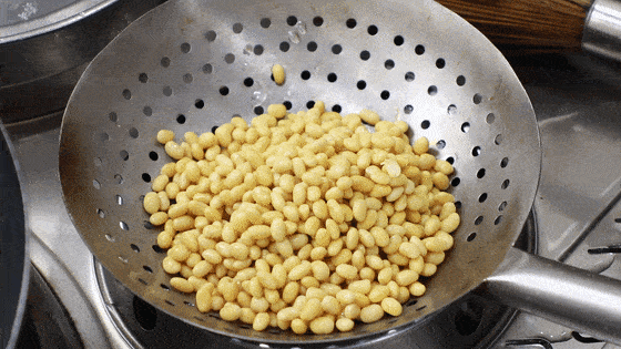 40分钟以后,黄豆已经非常的软烂,把黄豆倒出,切碎备用,这样煮酱的时候 更容易入味,锅内多放一些油,油温烧至5成热,倒入准备好的小料,开小火炸3分钟,把小料炸干炸出香味,小料变黄以后,倒入黄豆碎,保持小火炒5分钟,炒出黄豆中的水分~