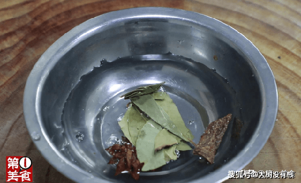 准备一个小盆,加入八角一粒,桂皮一节,几片香叶,再加入适量清水,浸泡10分钟,浸泡的目的是为了去除香料的异味,便于释放香味~