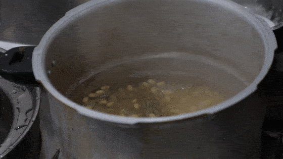 锅内烧水,倒入洗净的黄豆,把香料清洗干净,放入锅中,加入食盐3克 搅拌均匀,开大火把水烧开,然后把黄豆倒入高压锅中,压30分钟,把黄豆煮熟煮至入味~