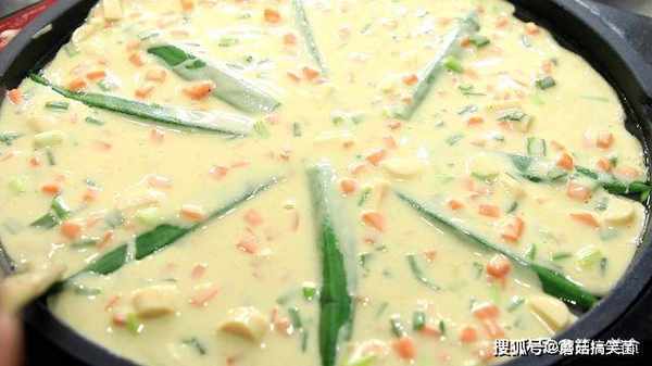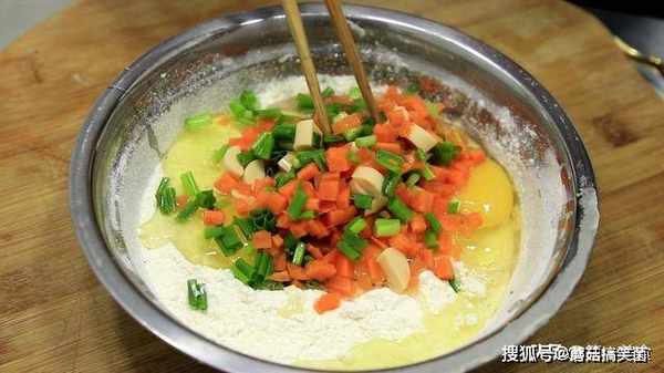2.200克面粉中打入三个鸡蛋,加入食盐2克、鸡粉2克、胡椒粉1克、十三香1克、倒入小葱花,火腿肠粒和胡萝卜粒。