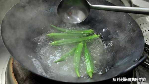 4.锅内烧水,放入食盐2克,放入食盐可以使秋葵的色泽更亮,水烧开以后放入秋葵焯水40秒捞出秋葵。