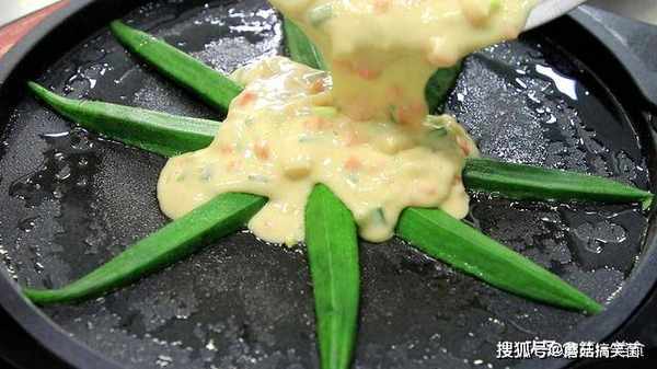 5.把秋葵切开一分为二,把电饼铛通电加热,用刷子刷上一层植物油,先把秋葵放在锅内,摆成图中的图案,倒入搅拌好的鸡蛋糊小心的铺平。