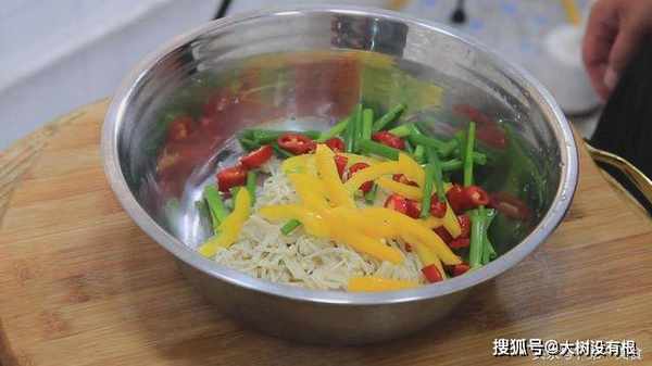 黄椒一片 切成黄椒丝,红辣椒一个 切成辣椒圈,这些都是用来配色的。