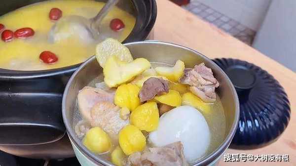 6.下入红枣,继续炖3分钟,这板栗土鸡汤就炖好了。鸡肉和板栗在一起炖,不仅汤鲜味美,而且营养丰富,建议每周炖一锅,养肾防寒。