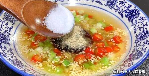 4.碗中再加一勺白芝麻,泼入热油,激发出香味,再调个味,依次放生抽、陈醋、蚝油、胡椒粉、食用盐、白糖,搅匀备用。