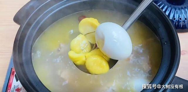 5.1小时后,打开锅盖,倒入板栗,3个剥壳的水煮蛋,一勺食盐,继续盖上盖子炖15分钟。