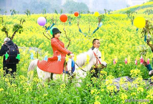 四川省泸州市合江县尧坝古镇油菜花海里,游客们在体验花海带来的乐趣。(图片由CNSPHOTO提供)