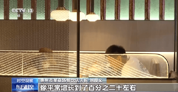 广东惠州市某商场餐饮店店长 刘厚义:客单量现在是明显有增长了,平常增长了百分之二十左右,周日节假日明显上涨幅度比较大,可能增长百分之三十左右。