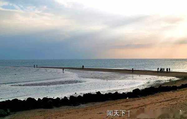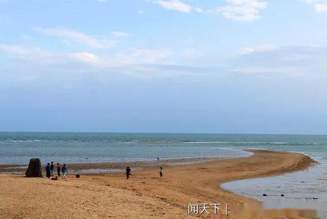 近处的浪也十分奇观,若隐若现的尖沙洲上游荡着变幻莫测的分水线,逶迤多姿,形态迥异。涨潮时,双海涌起的潮水,从不同方向同时发力,相互激荡拍打,浪打浪,打出一条条罕见的“十字浪”,有人浪漫地称之为“接吻潮”。一位游客站在分水线处,分开两腿,脚踏两个海域,举起双臂,兴奋地呼叫着。