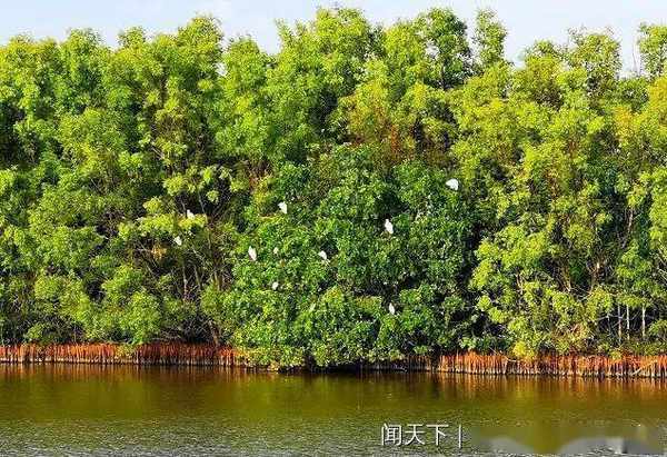 信步长长海堤,海天一色,如入仙境。密密麻麻的红树林,遍布漫长的海岸线,犹如一道绿色长城,蔚为壮观。微风中绿浪滚滚,婀娜多姿,树上的鸟儿成群结队,穿梭其间,构成一幅优美生动的风景画。