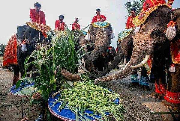 当地时间3月13日,泰国大城府,泰国大象日庆祝活动举行,大象们享受着水果和蔬菜的“自助餐”。图源:视觉中国