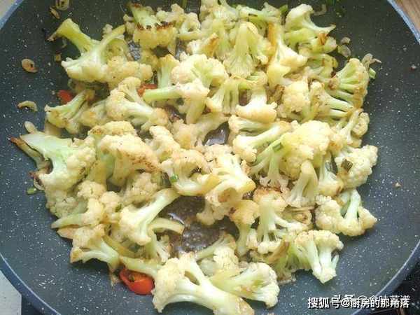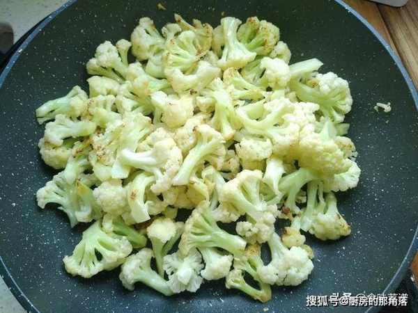 4、锅内加少量油,等待油热,下入菜花,干煸一下,炒至菜花边缘焦糊,盛出备用。
