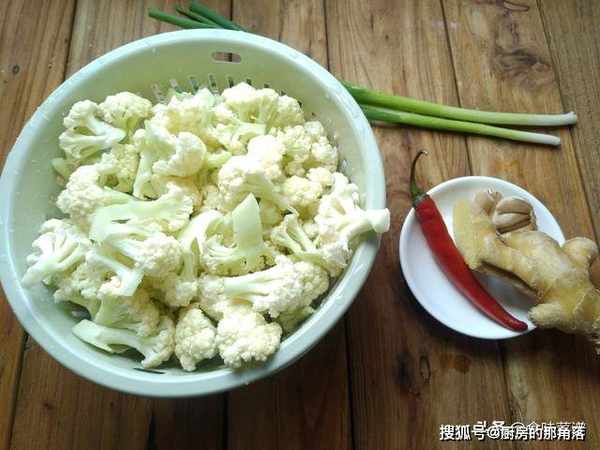 1、准备适量有机菜花、姜、小葱、小米辣,菜花洗净掰成小朵。