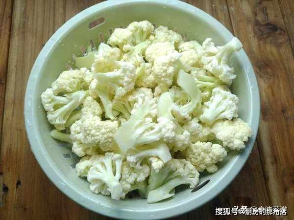 3、菜花尽量掰小一些,凉水中加入适量盐,浸泡10分钟,捞出控干水份。