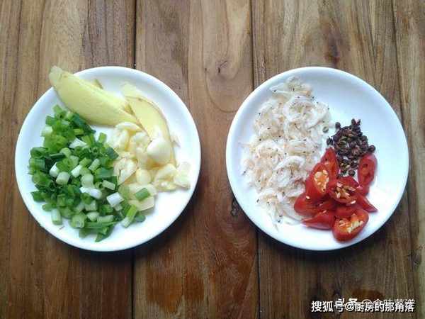 2、准备配料:虾米、花椒粒,小葱切成碎末,蒜姜切片,小米辣切成段。