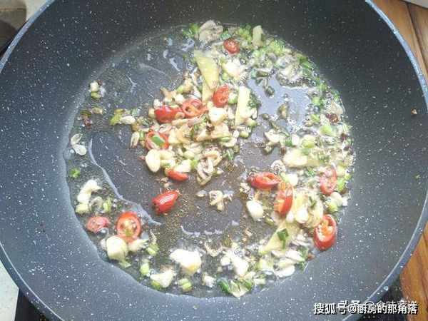 5、锅内再次加油,等待油热,下入花椒、姜片、蒜片和虾米,炒出香味。