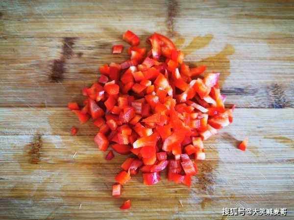 4、红色彩椒洗净,去籽去筋,切成小块状。红彩椒可以配一下菜品的颜色,让成品看起来更加的有食欲,黄色的彩椒也可以。